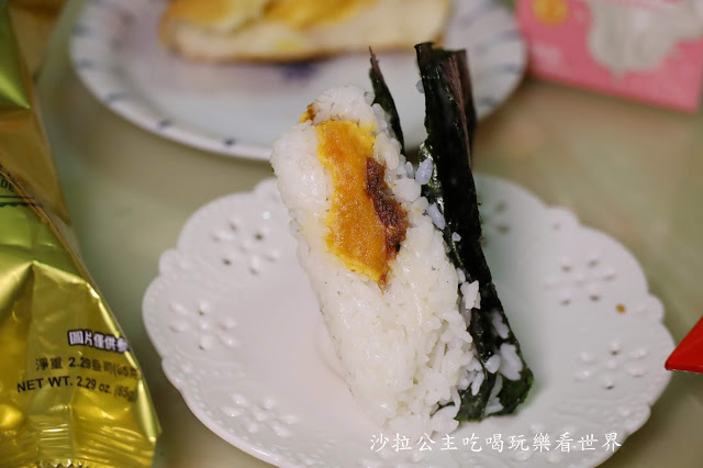 肉鬆包進米飯後變得非常濕潤,吃起來有點像濕掉的素肉鬆口感,內餡表現不差,但米飯今天不是很好吃