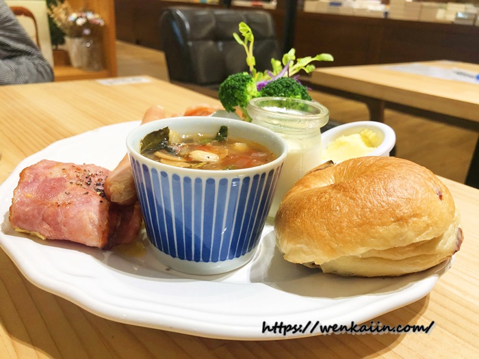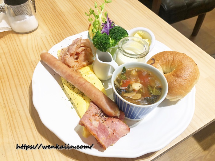 我先來介紹早午餐的部份,營養滿滿燻雞肉佐培根與德國香腸歐姆蛋貝果濃湯餐(280元)真的非常的豐富喔!除了有手工貝果跟特調醬搭配之外,可以看到整盤滿滿的食物中還有湯品、奶酪、歐姆蛋、雞肉、德式香腸等等,這樣一大份是真的會飽。