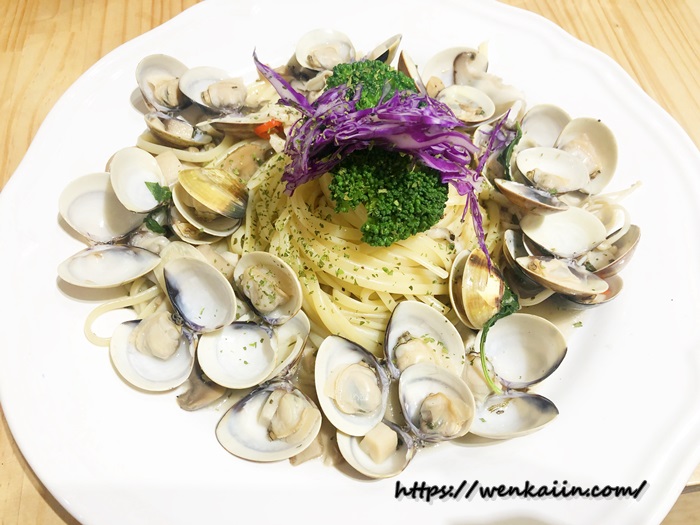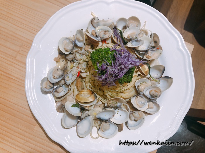 接下來要介紹的就是我當天吃的蒜香微辣爆多蛤蜊白酒細扁義大利麵(240元),端上桌看到滿滿滿的蛤蜊就覺得好療癒啊啊啊啊啊啊啊~