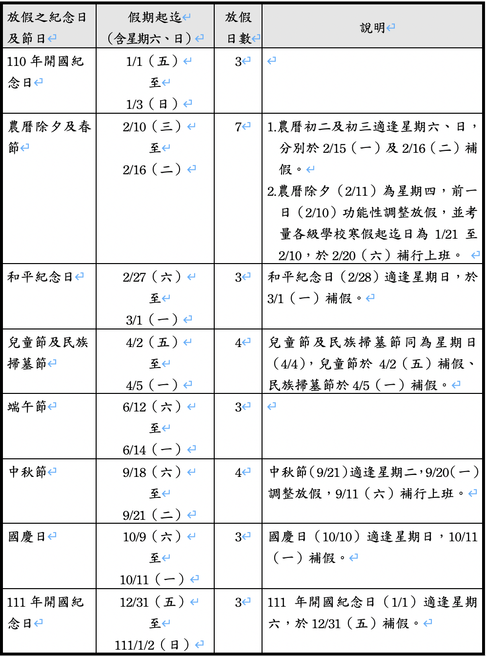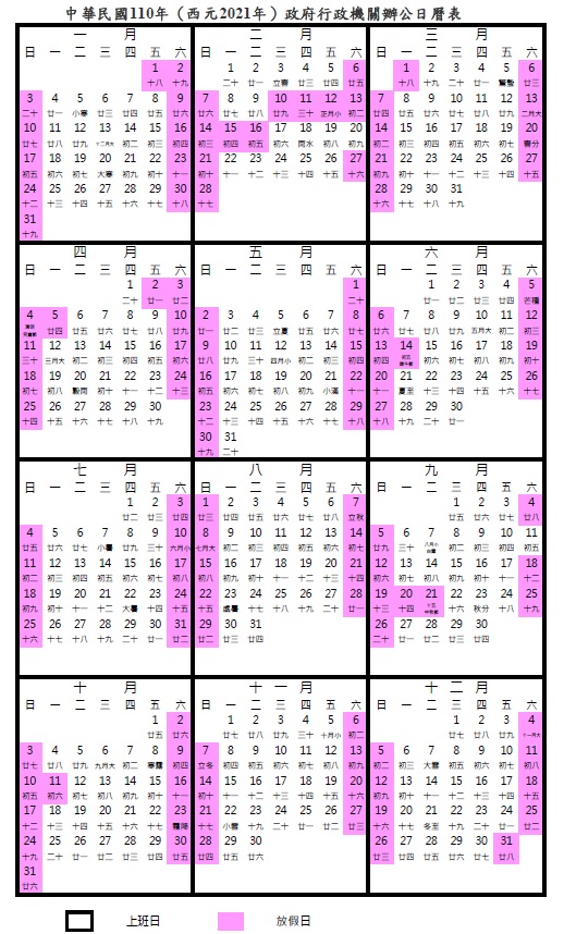 行政院人事行政總處公布民國110年(西元2021)行事曆