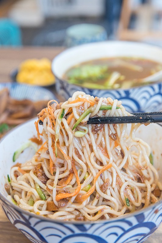 這狀元乾拌麵有一點像八寶醬乾麵,但肉醬的風味卻大異其趣,首先是少了一般醬拌麵常態性的鹹度,也許吃起來略不過癮卻相對耐吃許多,這拌麵即便不配湯也很可以,配料上一如畫面的豐富,多添了紅蘿蔔、黃瓜絲、豆芽感覺也清爽營養的多,最最最重要的是這碗狀元醬裡那抹像是櫻花櫻的肉香,非常非常迷人,也是這碗醬伴麵最大的不同。