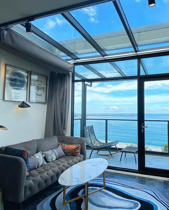 ▲大片玻璃窗灑落陽光與藍天,以及蔚藍海洋。(圖/IG @ariel_hsuan61)