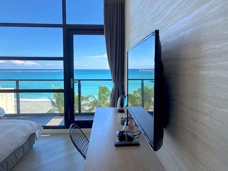 在遼闊的視野當中,望著海和交界處,碧綠、湛藍、青靛各種冷色調彷彿在窗外繪製成一幅美麗的畫作,配合著柔和自然光散發溫暖清新的感覺,讓入住的旅客看著窗外,心境也隨之開闊!