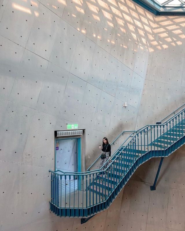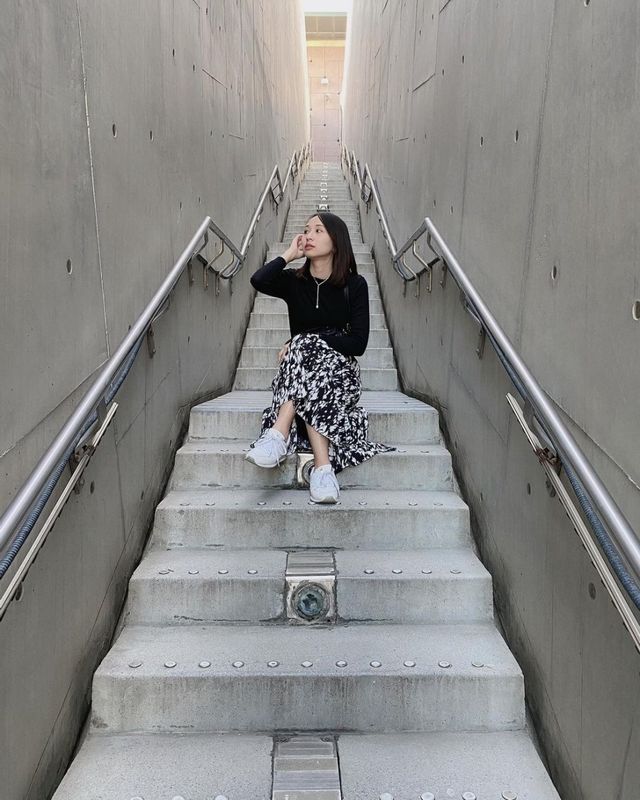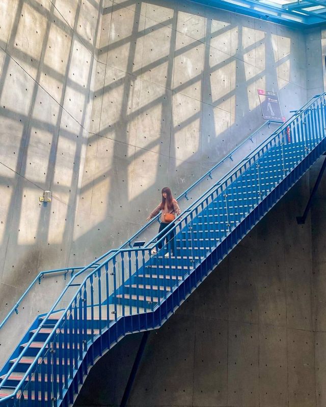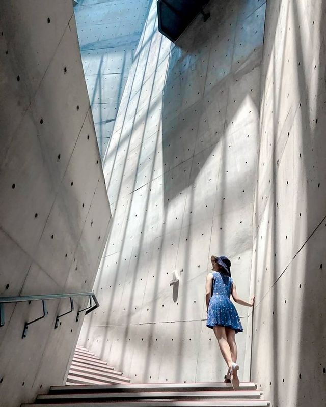 ▲光影灑落清水模牆面,緩步行走於長長的階梯上,象徵著走入歷史的記憶,探索過去。(圖/IG@xyodc)