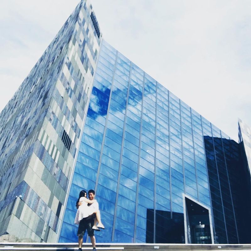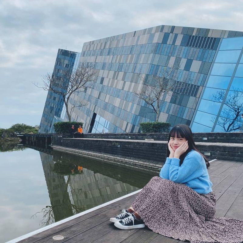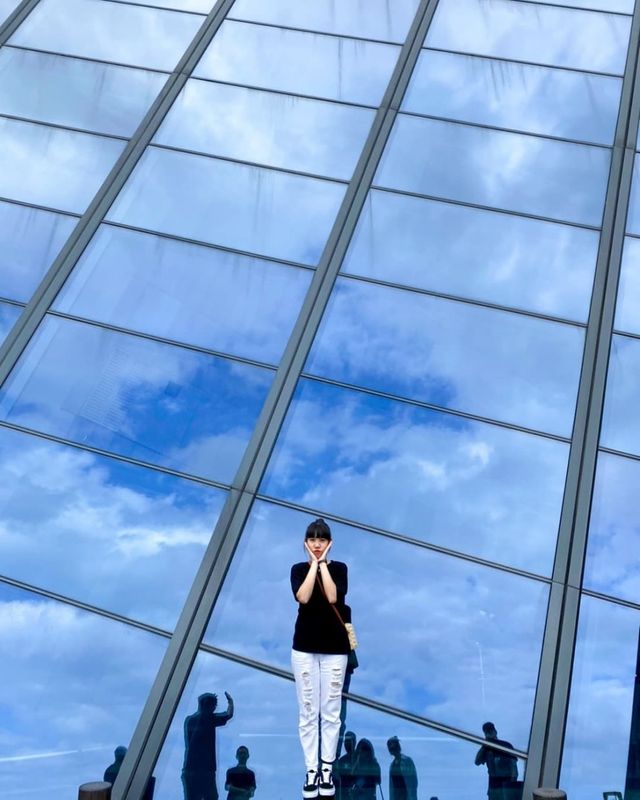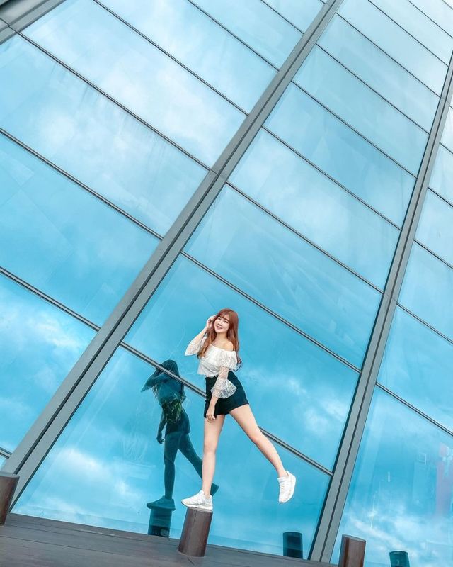 ▲博物館外知名的大面玻璃窗,如同天空之鏡倒映藍天白雲,是知名的打卡景點。(圖 / IG@7.eveon)