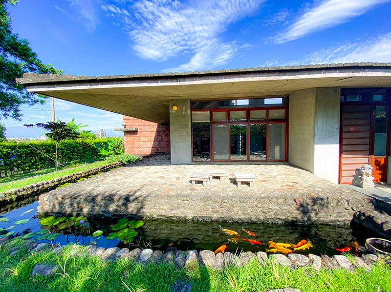 ▲壯圍張宅在倒映著藍天的池水中有著繽紛游魚,讓入住旅客心情隨之悠閒自在。(圖/ 張宅)