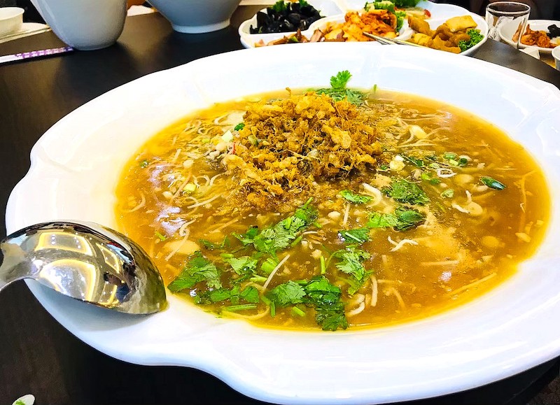 這是宜蘭特色美食-西魯肉的羹湯版,覆蓋在最上方蛋酥是這道菜的靈魂所在,油炸過後的蛋酥飄著濃濃蛋香,軟嫩的白菜也熬煮出了蔬菜的清甜。