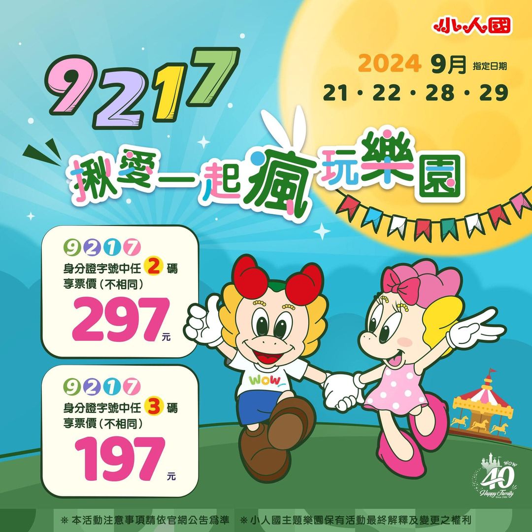 揪愛一起瘋玩樂園!小人國於9/21、9/22、9/28、9/29推出對身分證優惠,只要身分證數字中有「9、2、1、7」,不同數字任3碼即享門票197元(原價1,050元);不同數字任2碼即享門票297元(原價1,050元)。園區內有5大主題百座微縮景觀讓你輕鬆環遊全世界,還有20多項室內外遊樂設施無限暢玩,以及9月週末限定大雷雨2.0,快揪親朋好友一起暢玩!