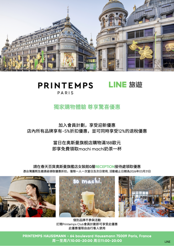 法國春天百貨PRINTEMPS與LINE旅遊合作,邀您親自前來,感受獨一無二的購物體驗。現在領取折扣邀請函,並至春天百貨奧斯曼旗艦店女裝櫃台,出示折扣邀請函,即享95折購物優惠、最高12%優先退稅,再送受大家喜愛的machi machi免費飲品,盡享多重禮遇。