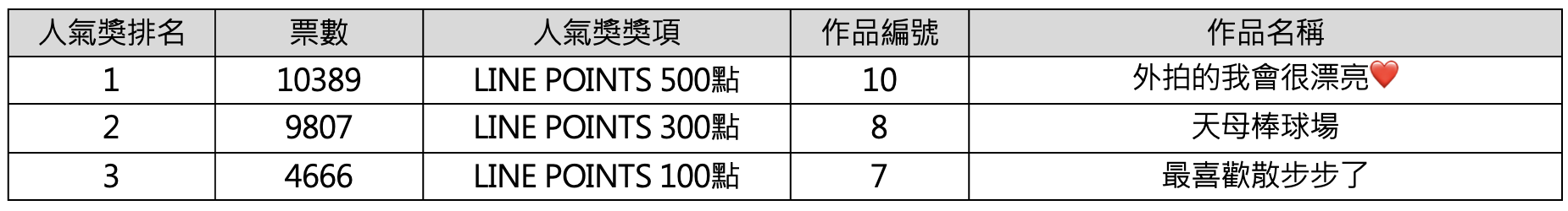 3. 每位投稿者(即單一LINE帳號)只能獲得1次人氣獎獎項,若獲獎者重複,則由次1名往前遞補。