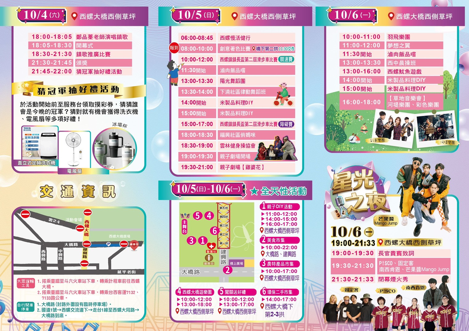 除了壓軸晚會外,10/4-10/6天天都有精彩活動!像是小朋友最愛的氣墊城堡樂園,今年推出超大規模的18米氣墊迷宮,還有糖果世界、無敵暴龍、花園樹屋等主題,通通可以免費玩!鞋子兒童實驗劇團也將帶來免費劇場表演《雞婆花》,適合大小朋友一同欣賞!一起在星空下度過一場溫馨又有意義的夜晚吧!上午10:00起在西螺大橋西側草坪、西螺大橋下、大橋路至建興路,也都有農產品市集、美食市集、二手市集可以逛!大小朋友都能盡情玩樂,10月中秋假期就來西螺享受最美好的三日慶典吧~
