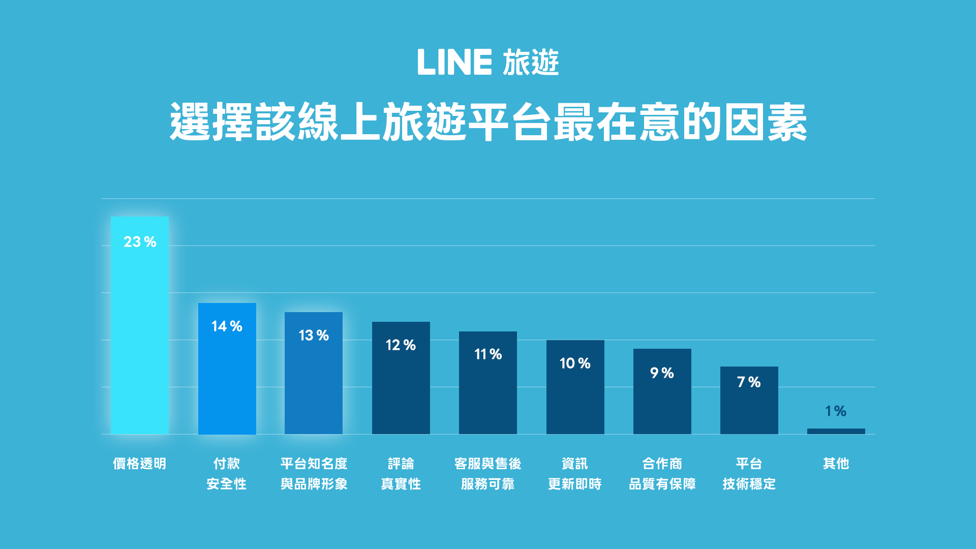 受訪者在選擇線上旅遊平台時,最在意的仍是價格透明(23%)、付款安全(14%)與品牌知名度(13%),評論真實性(12%)與客服服務品質(11%)這五個因素。簡單來說,大家更傾向選擇「好用又安心」的平台——不只是價格優惠,更要感受到流程清楚、交易安全、沒有隱藏費用的保障。