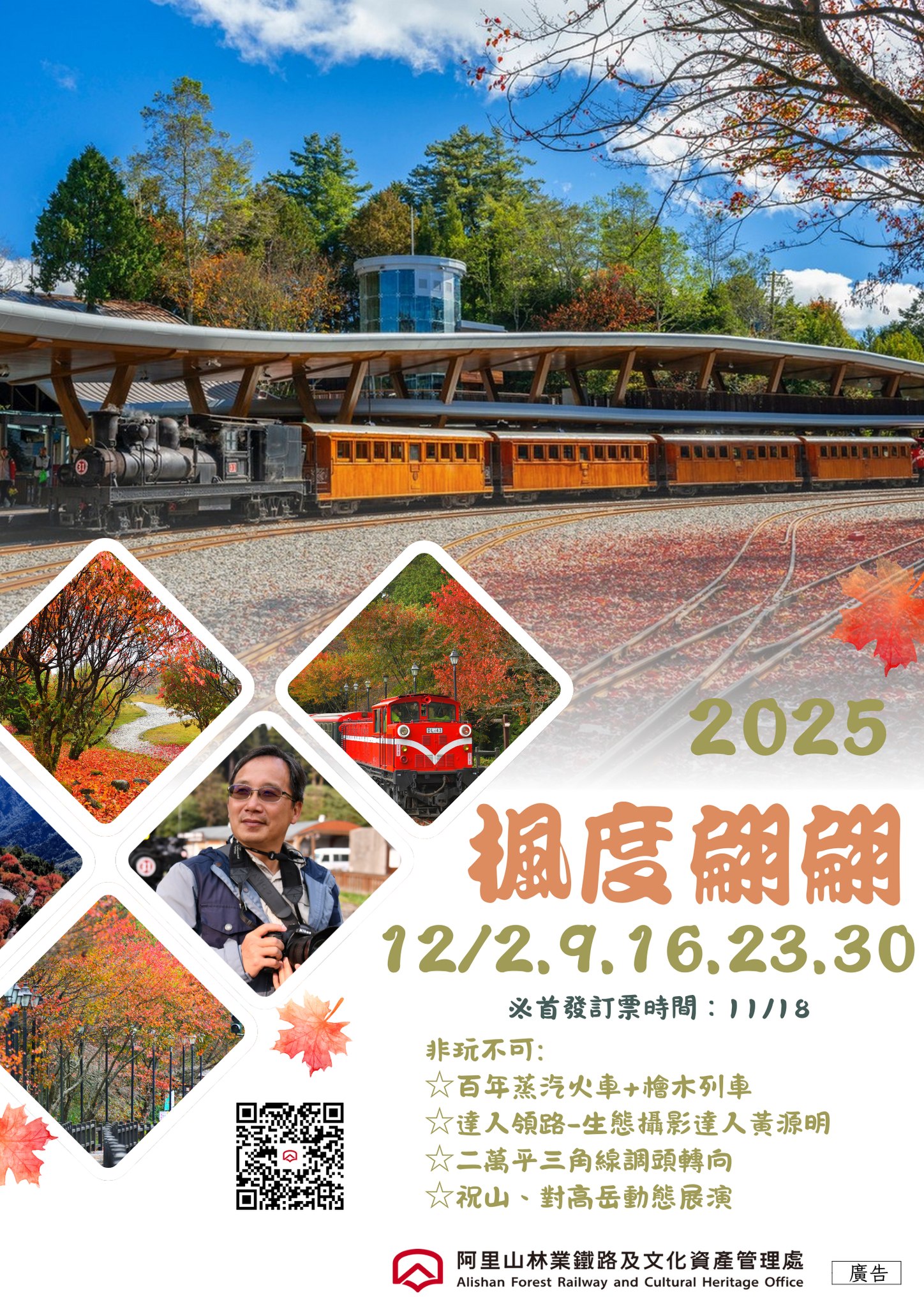 阿里山賞楓季即將展開,林鐵及文資處特別企劃「楓度翩翩」主題列車,邀您上山與秋日共賞楓紅。這趟旅程,將由國寶級31號蒸汽火車,牽引著臺灣檜木車廂緩緩前行,帶您拜訪林鐵沿線特色車站,探尋深藏的賞楓秘境。在百年鐵道穿梭林間的時光裡,一同感受高山森音的洗禮,擁抱山林的寧靜美好與鐵道獨有的魅力。