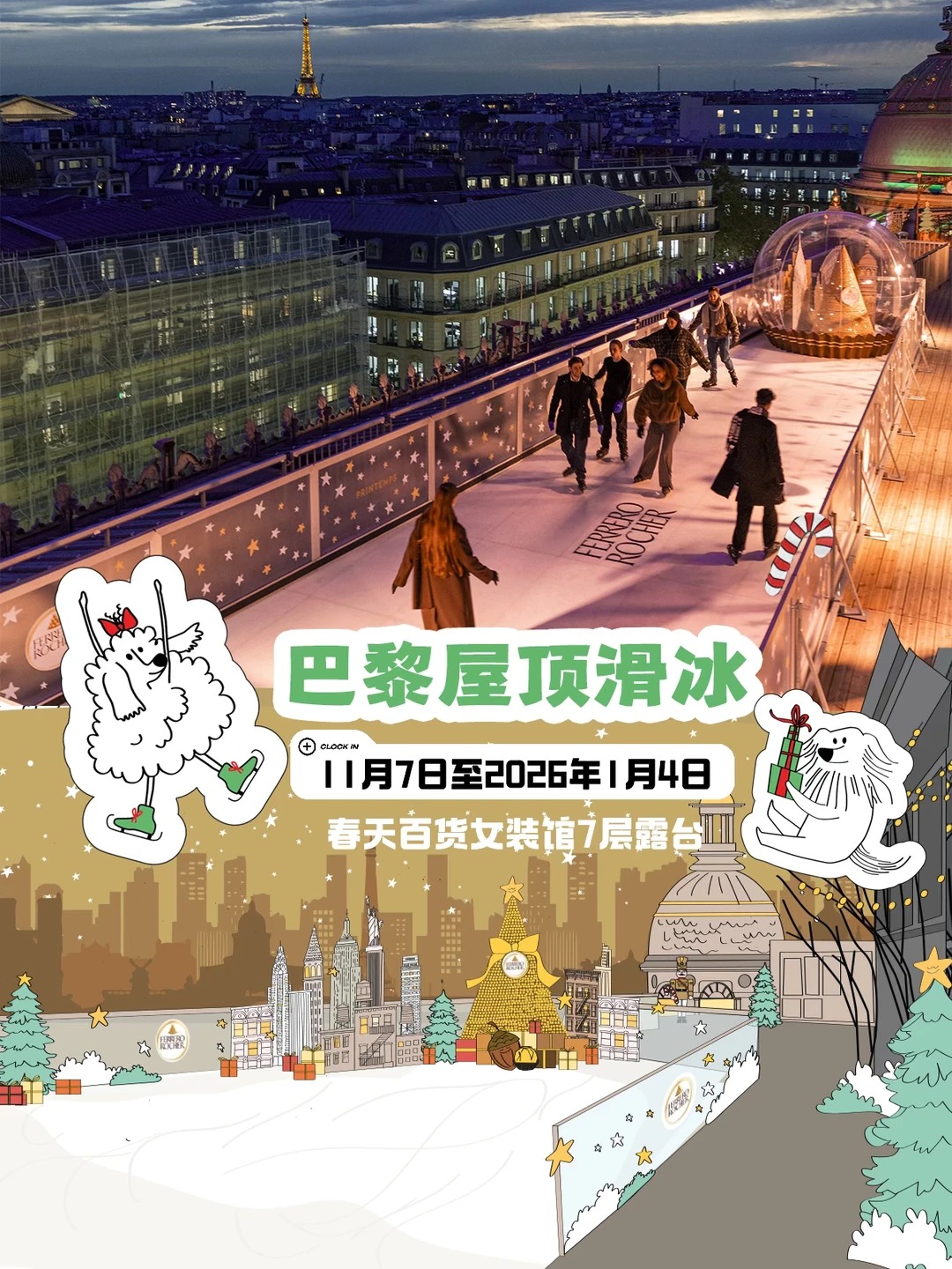 想體驗電影般的浪漫場景?登上春天百貨七層露台的費列羅屋頂滑冰場吧!2025年11月7日至2026年1月4日,免費在閃爍的巴黎夜空下,與愛人、朋友牽手滑行在冰面上,還有金色圓頂與艾菲爾鐵塔相映成趣,感受巴黎冬季最迷人的節慶。活動免費!記得提前上官網預約,一起度過夢幻的聖誕節。