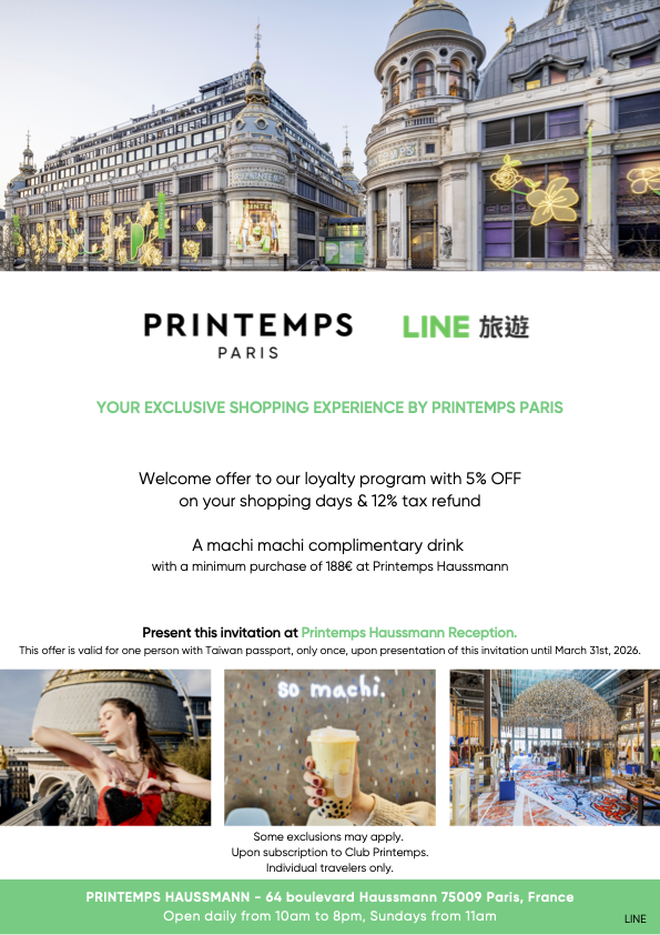 法國春天百貨PRINTEMPS與LINE旅遊合作,邀您親自前來,感受獨一無二的購物體驗。現在領取折扣邀請函,並至春天百貨奧斯曼旗艦店女裝櫃台,出示折扣邀請函,即享95折購物優惠、12%優先退稅,再送受大家喜愛的machi machi免費飲品,盡享多重禮遇。
