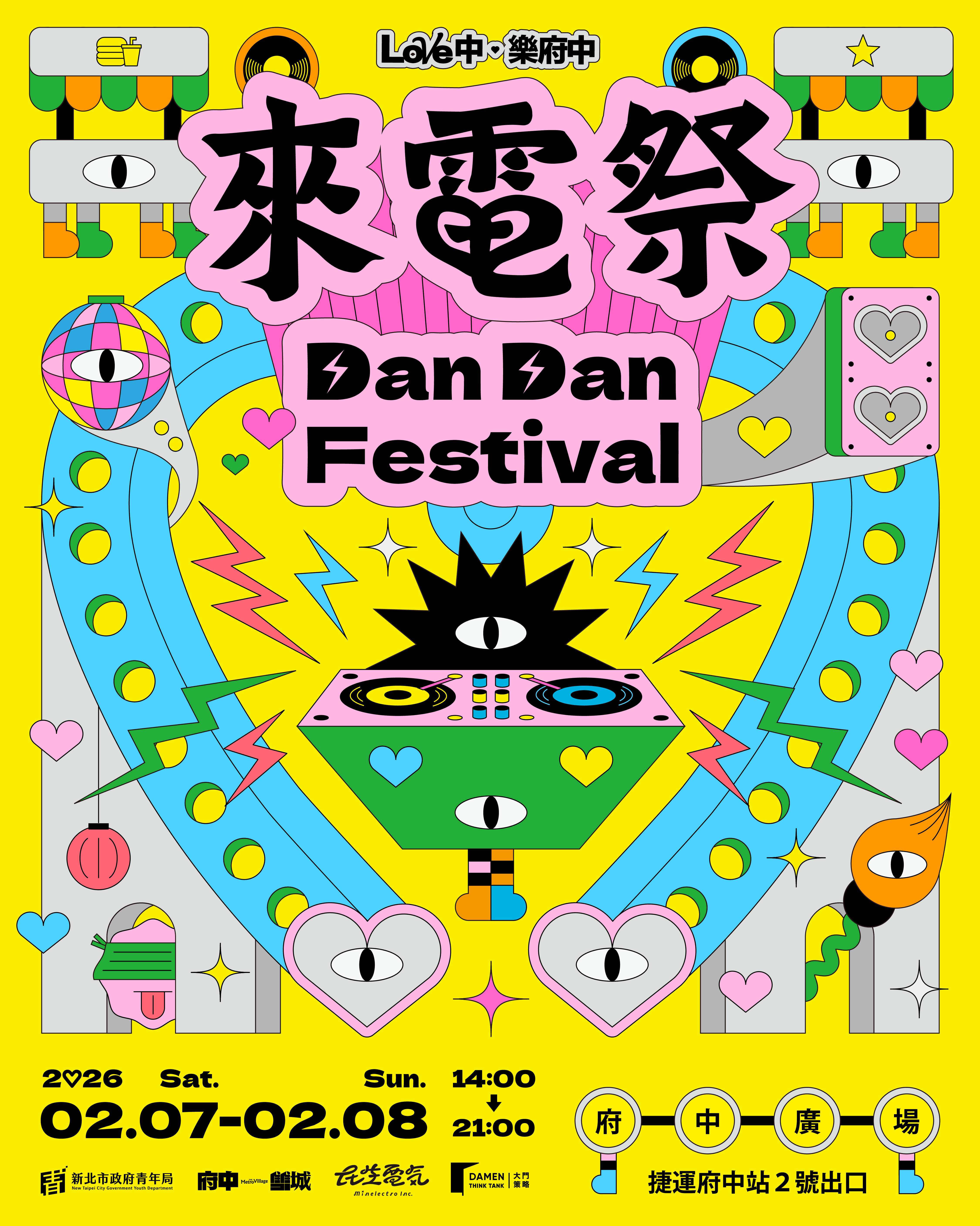 每年的情人節,就是要來府中廣場派對!跳舞!約會!今年新北市青年局推出樂府中「來電祭 Dan Dan Festival 」連續兩日的音樂派對,活動集結了12組獨立樂團與頂尖DJ,除了聽覺饗宴外,現場更規劃了趣味社交企劃與主題市集,讓每一位參與者都能在美食與創意的陪伴下,開啟全新的友誼篇章。