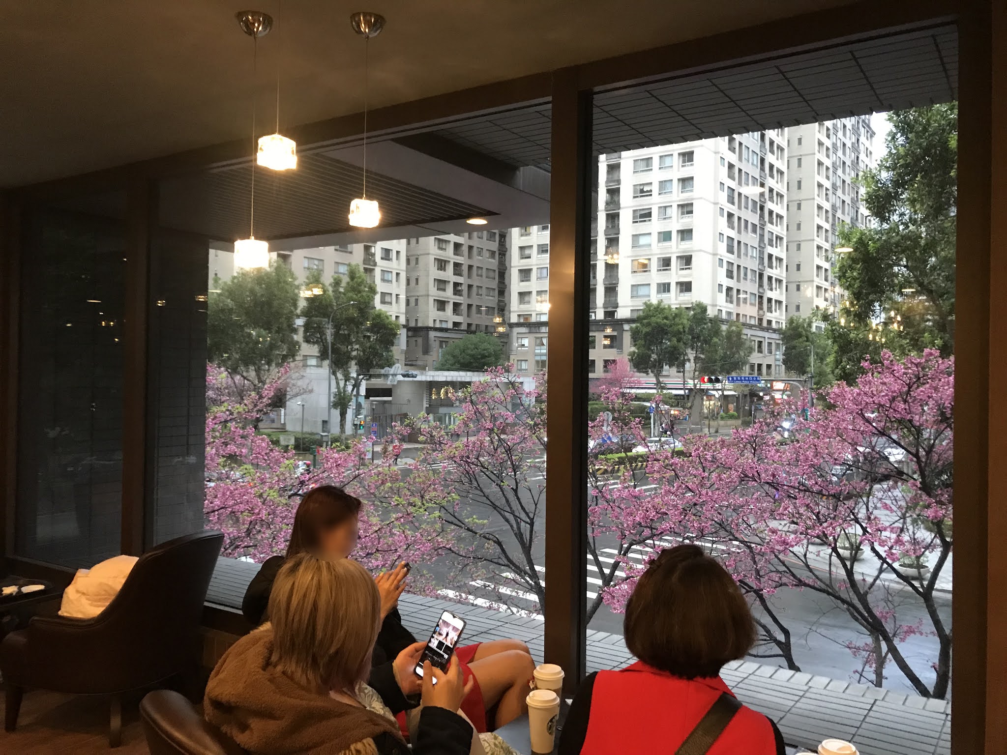 櫻花樹圍繞著整個福樺謙禮社區的一樓,雖然附近沿路都能看到櫻花樹,但這裡的開得最盛大也最美!這間Starbucks Coffee星巴克(林口文化三門市)就在三井Outlet附近,來逛三井可順便來賞櫻唷~