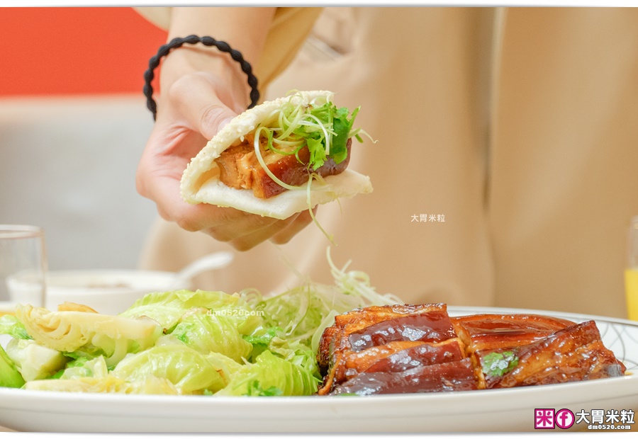 費時燉煮的東坡肉,肥瘦肉相間,看起來油亮誘人!搭配手工製作繼光餅,就像在吃台式刈包!
