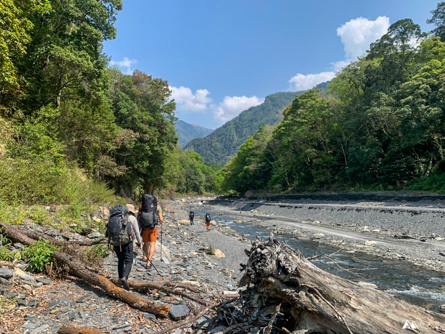 行走大約1小時候,就可以抵達這片廣大的河床,此時萬大北溪的溪流已經在旁邊只剩一點點了。也可以繼續沿著萬大北溪向前行,我們則是選擇沿著河床上切。這段路是最曬的部份,不過拍起來也很特別,有點荒漠的感覺。