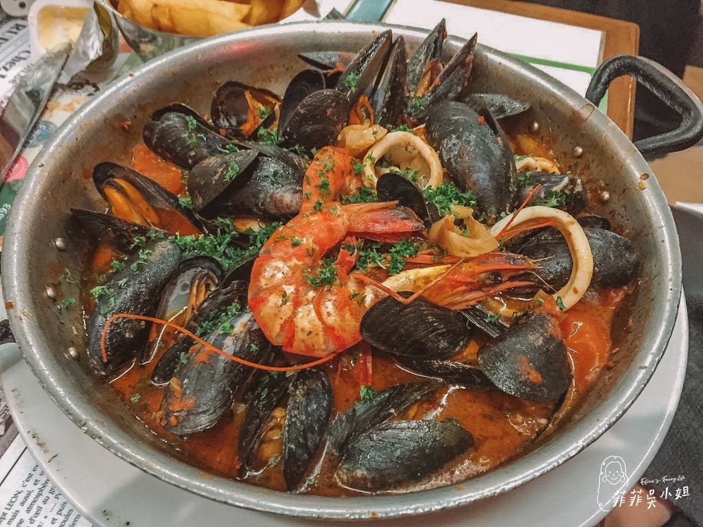 我點的是以蕃茄紅醬為基底的海鮮淡菜,除了淡菜,還有蝦子、花枝,以蒜頭、洋蔥炒香的醬汁香氣濃郁,淡菜吃完後還可以把無限續的麵包拿去沾醬汁,很好吃!