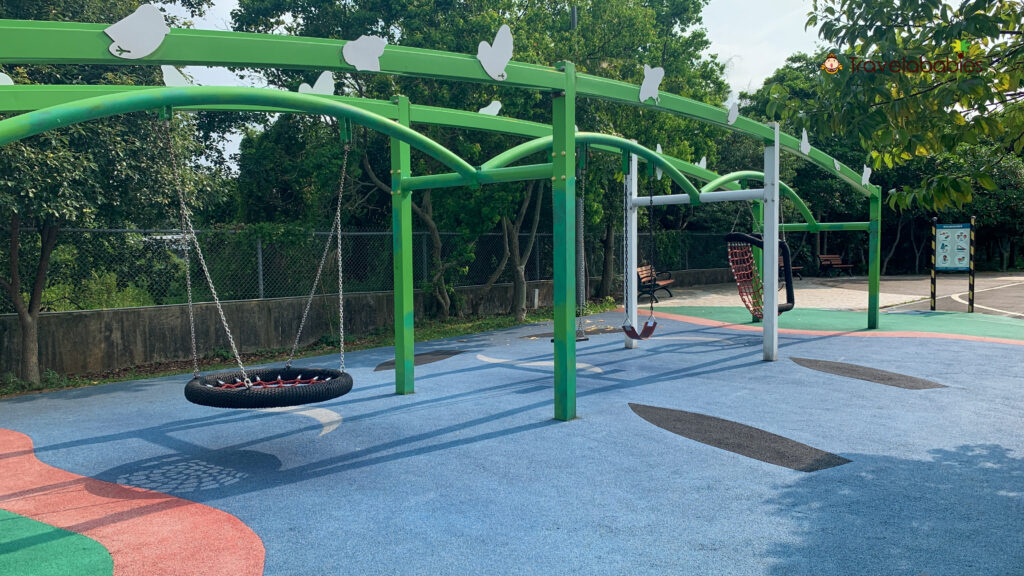 「漫步雲端區」用飛機時碰上亂流的概念設計,架高的搖晃攀爬設施,讓兒童不只挑戰體能且訓練身體協調、平衡及抓握能力,小朋友要如同泰山,運用鐵鍊踩在狹窄的木頭上才能前進;「離開地球表面區」有鞦韆和跳床讓小朋友離開地表,若還不過癮「飛躍叢林區」設置了2座山形攀爬網,用一旁周圍的樹木形成綠蔭,營造出叢林氛圍;「起飛搖晃區」則有另外兩座鞦韆,滿滿的遊具讓小朋友很幸福。