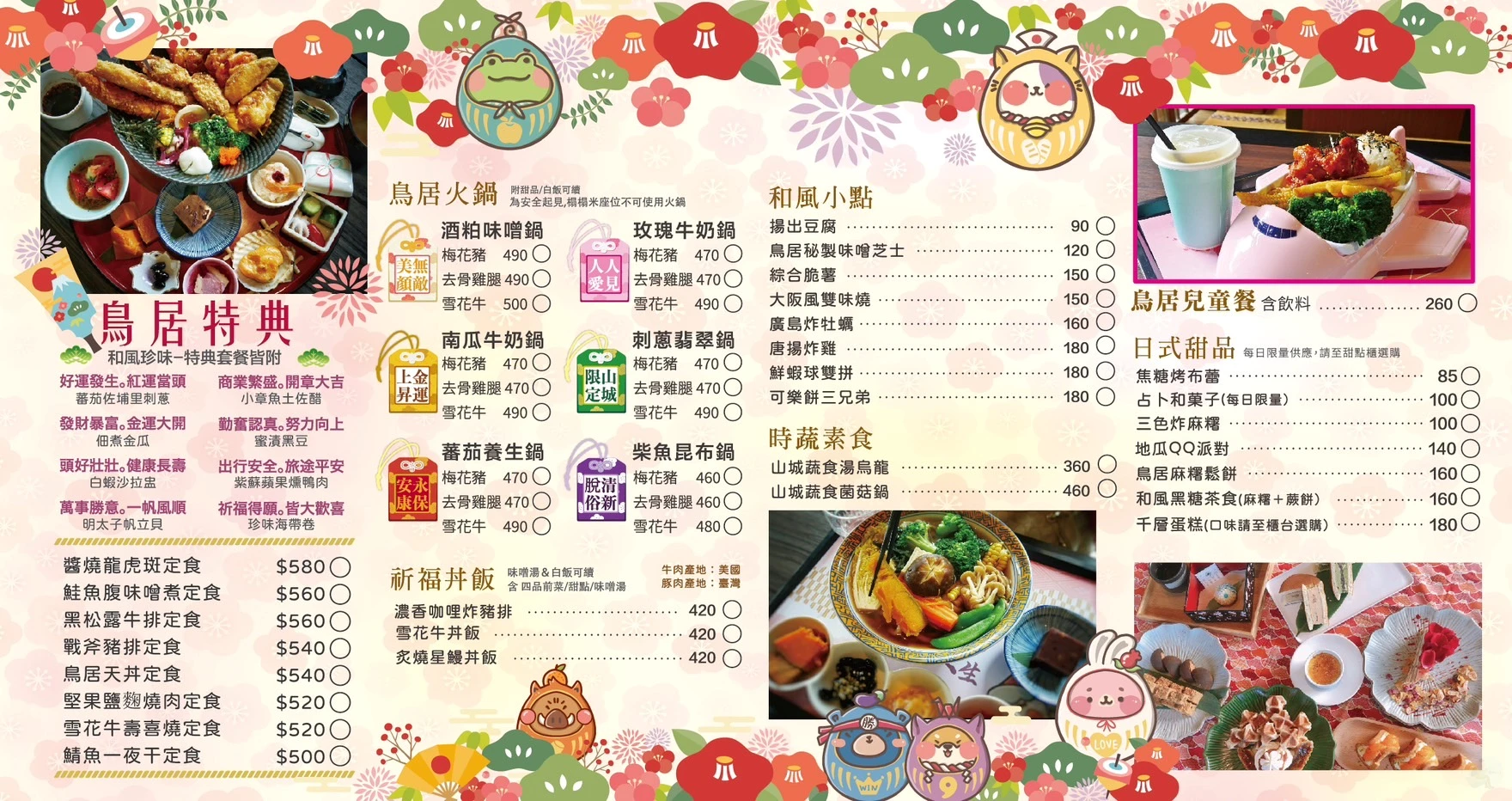 畢竟是觀光景點,餐點部分也不算便宜,定食部分約500元~580元,火鍋類470元左右,丼飯420元、小點心90元~180元,日式甜點85元~180元,還有兒童餐可以選耶!!!
