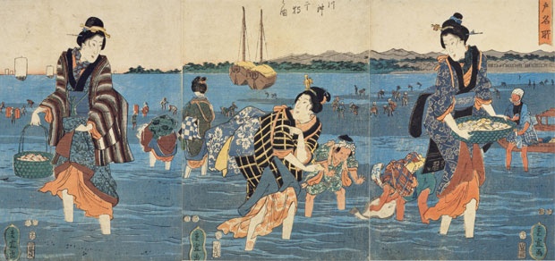 「潮干狩り」的歷史可以追溯到平安時代,但成為庶民的娛樂活動是從江戶時代到明治時代。根據《東都歲時記》,江戶時代的「潮干狩り」是從早上開始退潮,乘船出海,到中午左右海底變成陸地,然後從船上下來,撿拾蛤蜊、蛤蜊等,有時還會捕捉小魚或比目魚,在現場烹飪並舉行宴會。現代的「潮干狩り」已經成為了一種家庭和親子活動,特別是在日本春季和夏季時。許多地區會舉辦「潮干狩り」活動,讓遊客和當地居民共同享受收集海洋生物的樂趣。