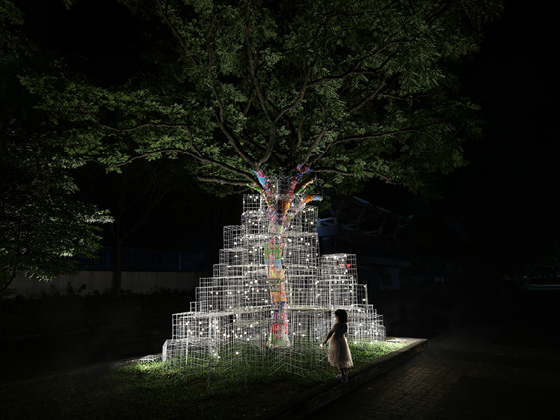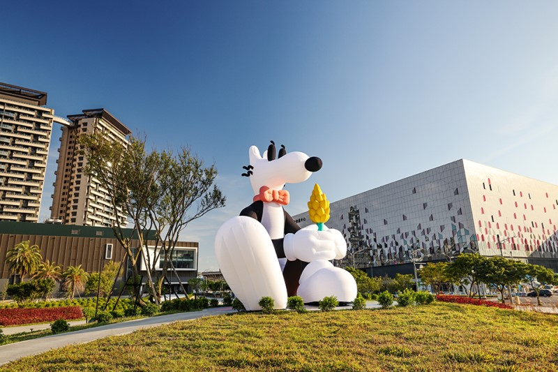 在青埔展區將會看見知名藝術家Steven Harrington,用其聞名國際的狗狗IP「Mello」創作的藝術裝置作品,藝術家讓Mello手持著魯冰花,將東西方文化互相結合,將創意與活力注入桃園。