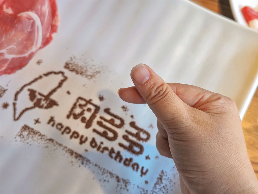 巧克力粉在盤中寫下了肉多多,再附上手寫生日卡,