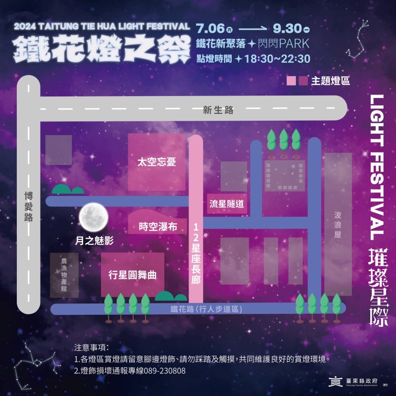 台東縣政府於鐵花新聚落推出「鐵花燈之祭」,第一季「繁花盛宴」獲得民眾熱烈迴響,立刻加碼推出第二季,這次以「璀璨星際」為主題,將於7月6日至9月30日閃耀登場,每天18:30至22:30亮燈,帶給民眾今夏最奇幻太空星際主題活動。