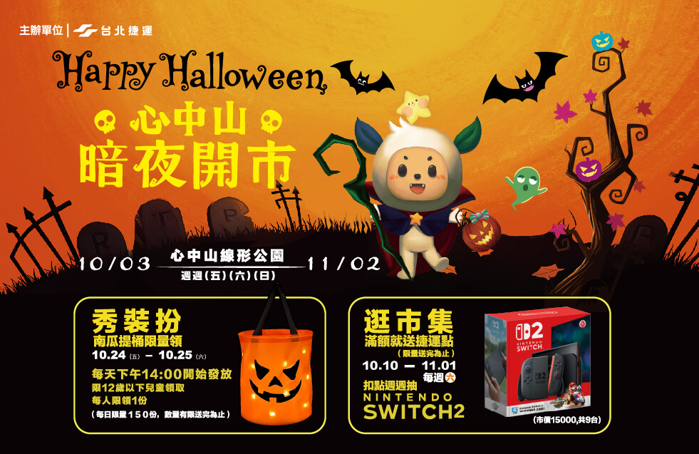 文化潮流集聚地的「心中山線形公園」,每年都不缺席萬聖節熱潮!今年由台北捷運公司與有趣市集主辦的《心中山 哈囉鬼派對》已邁入第2屆,即日起至10月底每週五、六、日變身「萬聖市集」,現場集結手作甜點、特色餐車、特調飲品與獵奇小物,不僅能逛市集、抽捷運點數好禮,還有4米高的捷米造型氣球陪你拍照打卡,10/24–10/25還有限量南瓜提桶變裝活動,大小朋友都能沉浸在濃濃萬聖氛圍中!
