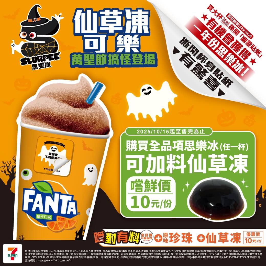 今年萬聖節,7-ELEVEN 推出超有創意的搞怪飲品「仙草凍可樂思樂冰」,把ㄉㄨㄞㄉㄨㄞ仙草凍加入冰涼可樂思樂冰中,喝起來既涼爽又充滿台味驚喜!從10月15日起限量開賣,大杯只要39元、特大杯也只要45元,還能加10元升級加入「嚼對有料」仙草凍。同步舉辦「幽靈杯撕撕樂」活動,最高有機會獲得一年份免費思樂冰,讓搗蛋也變得很有趣!萬聖節期間(10/24–26、10/31–11/2)還有限時買一送一優惠,趕快揪朋友一起來嘗鮮!