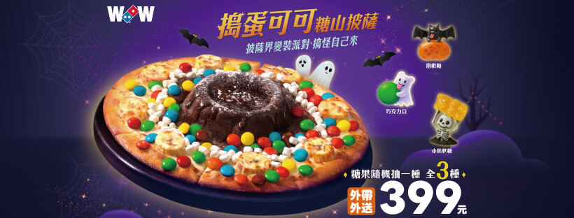 披薩也能變裝!萬聖節期間,達美樂推出「搗蛋可可糖山披薩」,將香蕉與濃郁可可結合,再搭配隨機抽出的巧克力豆、小熊軟糖或雷根糖,讓你親手把餅皮變成甜點藝術品!搭配限量販售的萬聖節套餐最低47折起,從雙拼組合到人氣炸物拼盤通通有,甜鹹雙吃一次滿足!