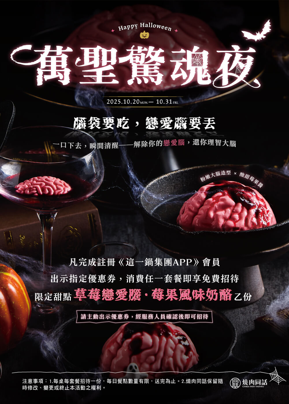 今年萬聖節,不只搞怪還要搞「腦」!燒肉同話端出話題新作——萬聖節限定甜點〈草莓戀愛腦〉,粉嫩腦袋造型搭配酸甜莓果醬,外型療癒又有趣,一口咬下奶酪滑順中透著莓果清香,不只讓戀愛腦瞬間清醒,更是萬聖節最上鏡的拍照打卡點心!