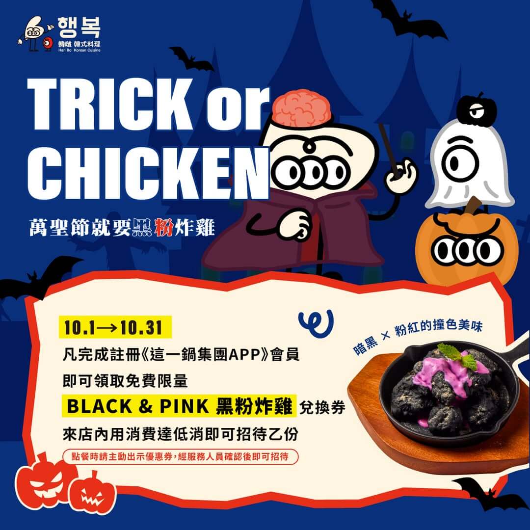 現在只要註冊《這一鍋集團 APP》成為新會員,即可獲得「黑粉炸雞」免費兌換券;活動期間來店內用達低消,還能現場兌換,限量招待乙份。搞怪裝扮、節慶聚會,就差這盤驚喜加持的夢幻炸雞!