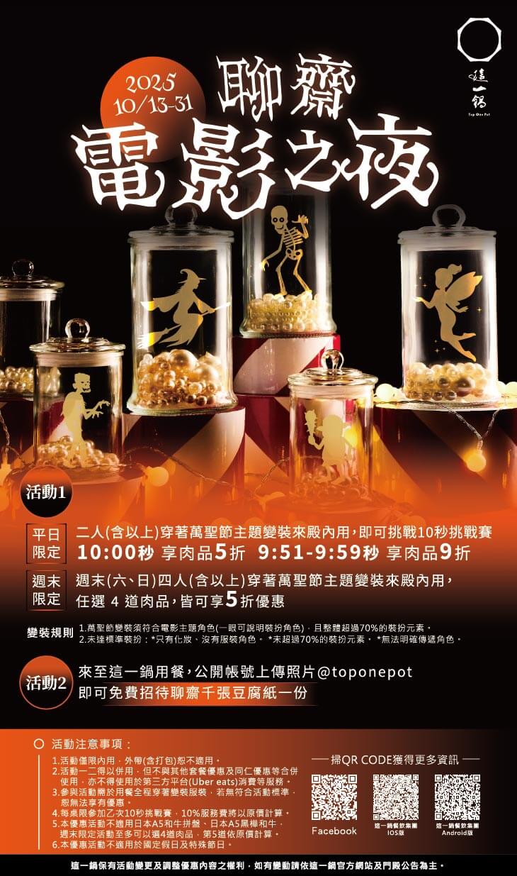 火鍋控絕不能錯過這一鍋餐飲集團的萬聖企劃!旗下品牌「這一鍋」今年以《聊齋電影之夜》為靈感,把全台10間門市變身為充滿中式奇幻氛圍的電影片場,開鍋同時還能沉浸式體驗妖魅萬聖場景。不只如此,變裝用餐可享肉品優惠,現場拍照打卡還能免費兌換「聊齋千張豆腐紙」,體驗鬼畫符創意樂趣,讓萬聖節晚餐不只是吃,更是一場視覺與味覺的奇幻冒險!
