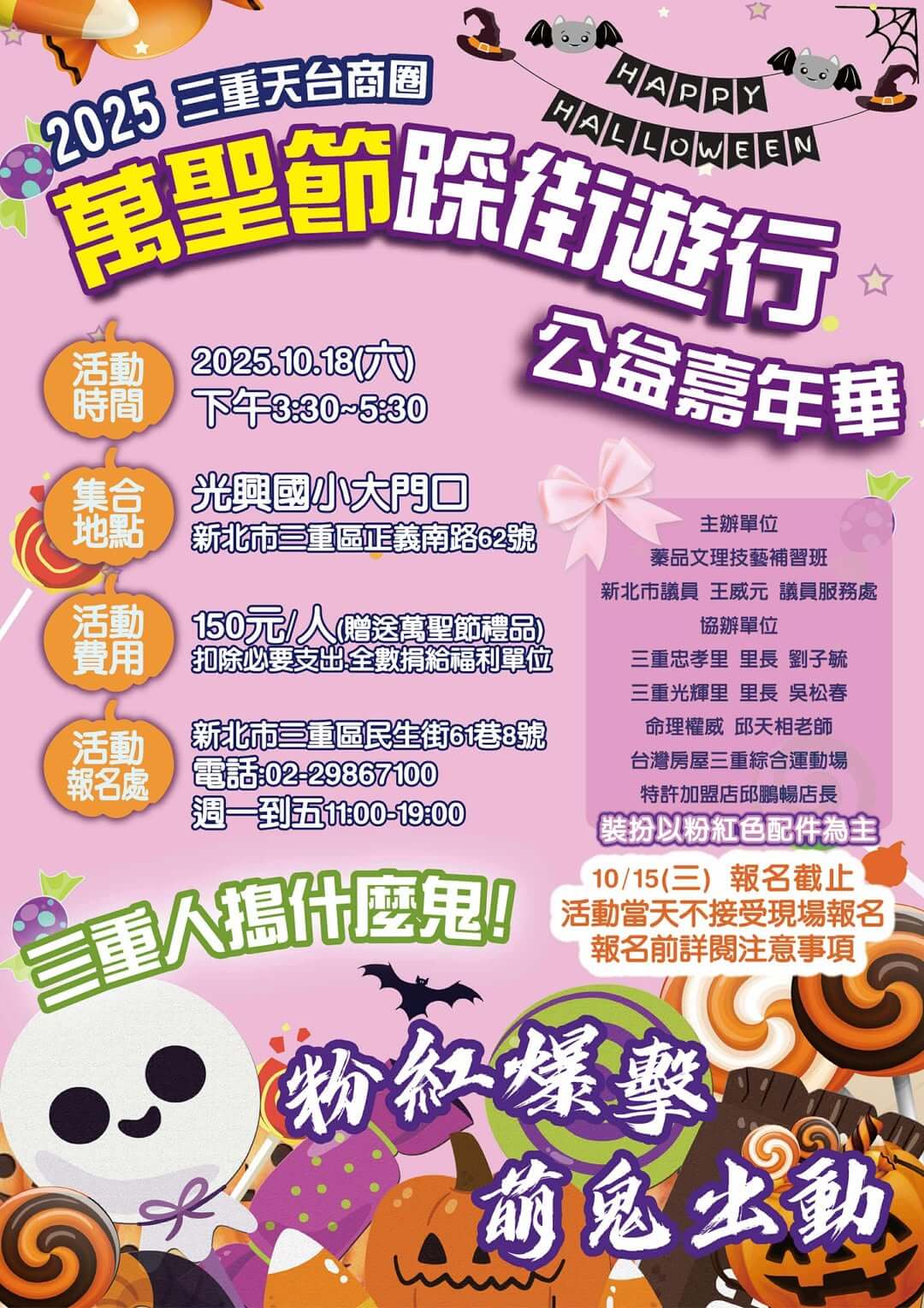 今年萬聖節不搞黑,改走最潮「粉紅爆擊」風格!三重天台商圈首度舉辦萌鬼踩街嘉年華,邀請你穿上粉紅造型走上街頭,不但能變裝拿好禮、參加公益、還能與街坊一起鬧翻天!就算沒粉紅裝備也沒關係,現場提供貼紙變身最Q萌鬼!趕快揪上親友,一起加入這場最暖最潮的萬聖盛會!活動費用150元(含萬聖節禮品,扣除必要支出全數捐出)