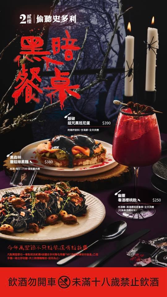 今年萬聖節,貳樓不只是端出限定餐點,更邀來人氣驚悚 Podcast《偷聽史多利》,聯手打造一場結合「美食 × 鬼故事」的《黑暗餐桌》體驗。從墨黑辣麵、詛咒班尼蛋到幽靈調酒,每一道料理都有一段詭異的故事等待揭曉。點餐即可獲得限量「NFC恐怖故事迷你盲盒」,手機一貼即能聆聽三款隨機驚魂故事,讓你在吃飯時同步進入懸疑宇宙。活動至10/31止,全台貳樓門市限定登場,這個萬聖節,就來貳樓放膽入席,一邊用餐、一邊發抖吧!