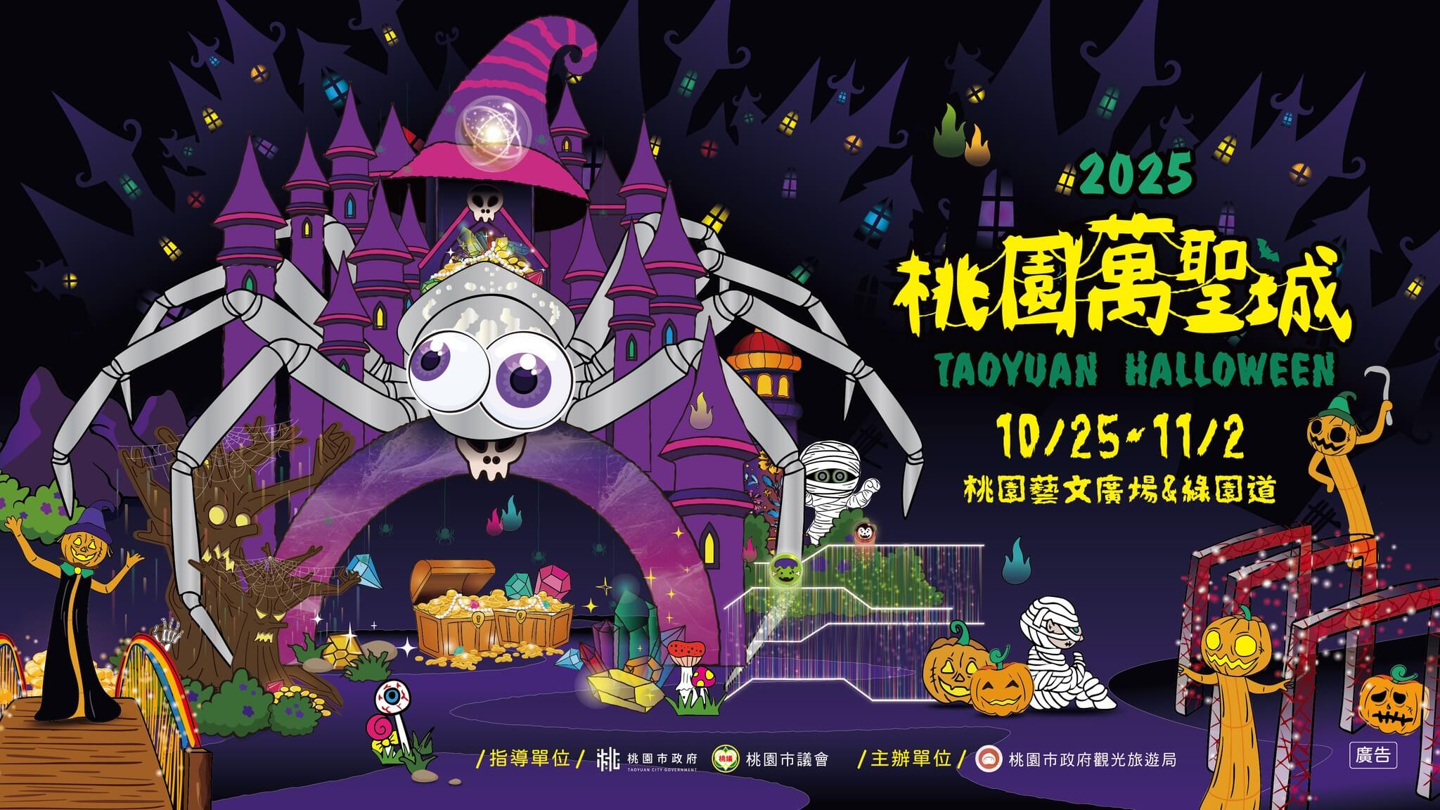 萬聖節怎能少了桃園的「萬聖城」!今年從10/25起,桃園藝文廣場化身「魔蛛古堡」,有13公尺高的魔幻蜘蛛王坐鎮,還能穿越盤絲洞、闖迷宮、找寶藏,每晚還有燈光秀與變裝電音派對嗨翻天。想來點沉浸式體驗的,也別錯過大溪笠復威斯汀飯店的「萬聖寶藏島」,館內打造神秘海盜墓園與骷髏禁地,一邊打卡一邊享受親子活動與限定餐飲,讓萬聖節不只搞怪,還能住得盡興玩得過癮!
