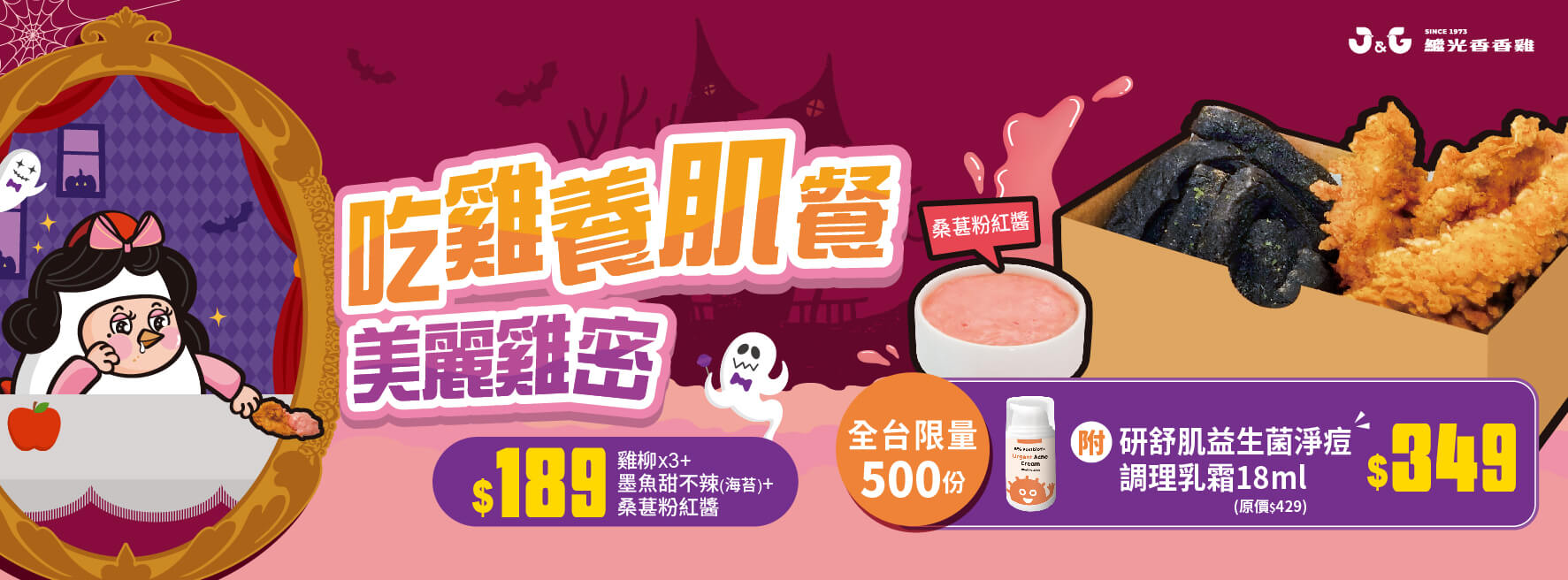 萬聖節不只搞怪,也能吃得漂亮!台灣炸雞品牌繼光香香雞首度聯名保養品牌 ELLO研舒肌,推出話題性十足的「吃雞養肌套餐」,炸雞控與保養控都尖叫!餐點內容包含酥脆雞柳、人氣墨魚甜不辣,沾上酸甜「桑葚粉紅醬」更添萬聖節浪漫氛圍,隨餐還限量附贈益生菌淨痘乳霜,吃得開心也能顧肌膚。外包裝更像是行走的御守袋,視覺吸睛,話題滿分,限量 500 組售完為止,快揪姐妹們搶一波!