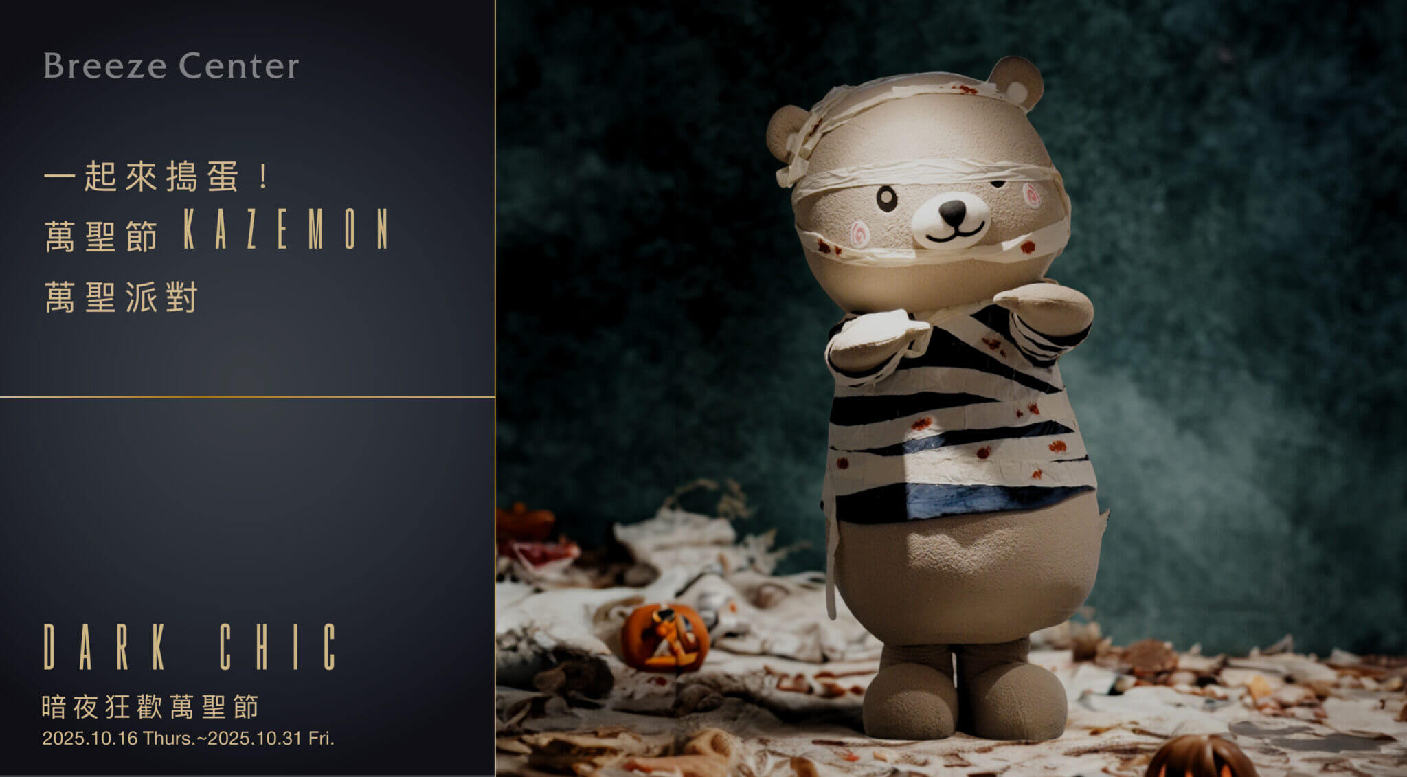 今年萬聖節,微風百貨不只是吃得搞怪,更能玩得盡興!10/31當天限定的「KAZEMON萬聖派對」將在微風廣場、南京與台北車站三館登場,萌度爆表的「微風熊」也換上萬聖裝現身巡館,和大小朋友互動拍照。只要拍下與微風熊的合照並上傳 IG、標記 @BreezeCenter,就有機會獲得神秘好禮,讓你一邊打卡、一邊收服節慶驚喜!