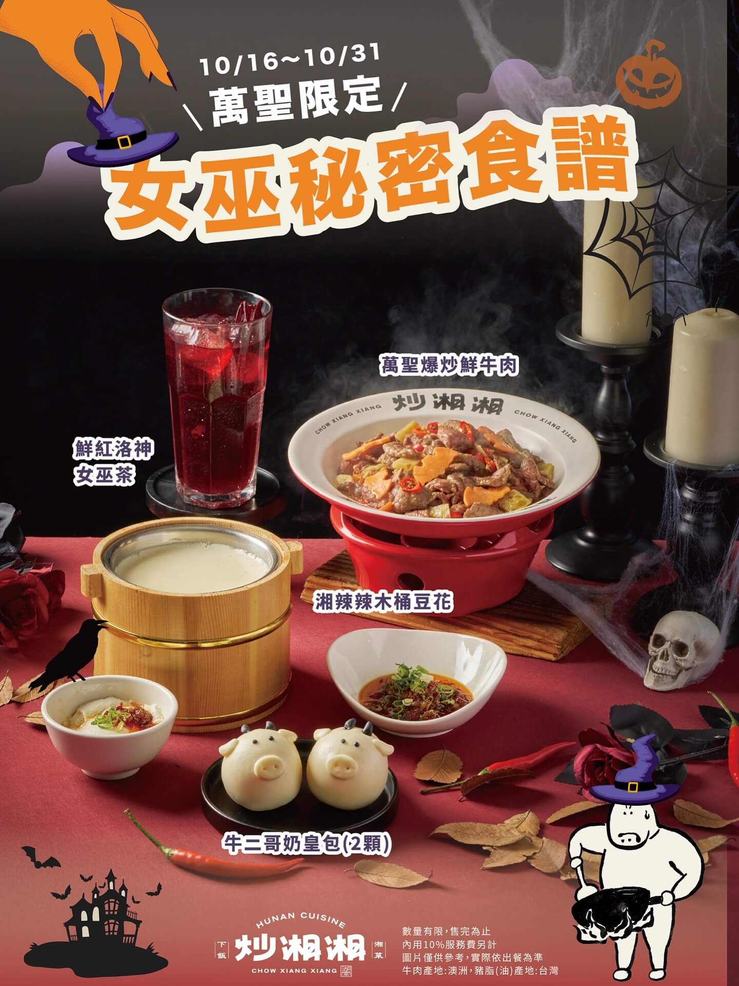 嗜辣者請就位!湖南菜新星「炒湘湘」今年萬聖節以「女巫秘密食譜」為主題,大膽玩出香辣新高度。不只味蕾升溫,連視覺也被「萬聖爆炒鮮牛肉」驚艷到,小蝙蝠造型紅蘿蔔藏身火辣牛肉片中,每一口都超下飯;想解辣?推薦搭配一杯「鮮紅洛神女巫茶」,血紅色澤神祕感十足,酸甜爽口超解膩。甜點控不能錯過「牛二哥奶皇包」,圓滾造型融合炒湘湘吉祥物,咬下瞬間奶香四溢;還有最具創意的「湘辣辣木桶豆花」,將香辣與嫩豆花激盪出驚喜口感,一端上桌就成為萬聖節聚餐焦點。
