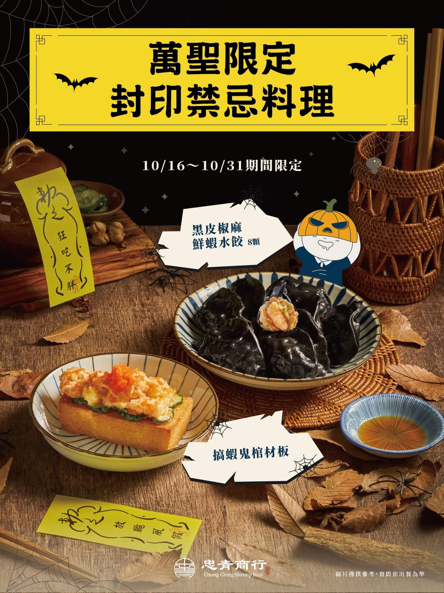 平常就以家常創意菜打出名號的「忠青商行」,今年萬聖節端出視覺系暗黑料理!以招牌蝦仁炊飯聞名的他們,這回推出厚片變身「搞蝦鬼棺材板」,將吐司炸至金黃酥脆,裡頭滿滿鮮蝦、小黃瓜與蝦卵內餡,一口咬下鹹香鮮甜、層次豐富;另一款「黑皮椒麻鮮蝦水餃」更是全場焦點,烏黑墨魚汁包裹下的水餃外皮Q彈勁道,搭配內餡蝦仁與微辣花椒香,嗜辣控絕對不能錯過!創新台味結合節慶氛圍,讓萬聖節餐桌也充滿驚喜感。