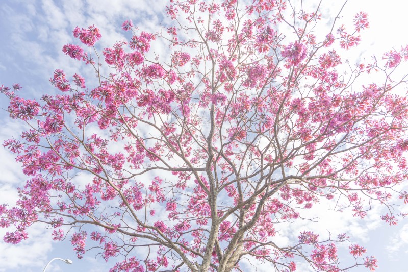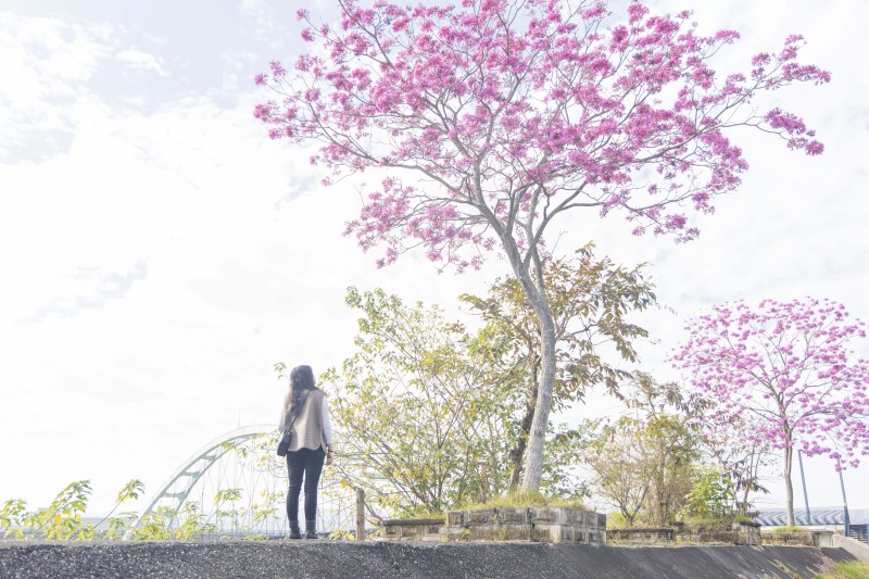 貓羅溪堤防上的洋紅風鈴木因樹木高大,從低角度往上拍攝,彷彿進入了童話世界。無論是站在花樹下仰望,還是遠距離取景壓縮畫面,都能拍出令人驚豔的視覺效果。特別是使用長焦鏡頭,將花海與人物巧妙融入構圖中,更能拍出張張如明信片般的美照。