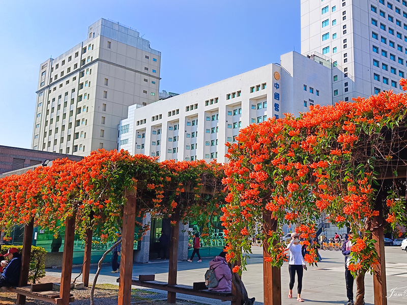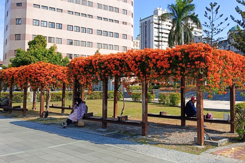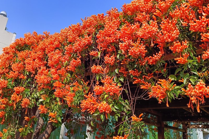每到冬季與春季交替之際,【台中中正公園炮仗花涼亭】便迎來1年中最繽紛燦爛的時刻。大片橙紅色的炮仗花如瀑布般傾瀉而下,覆蓋整座涼亭,為這片都市綠地增添一抹熱情洋溢的色彩。陽光灑落在層層綻放的花朵上,微風吹拂間,花串輕輕搖曳,如同盛開的火焰,將整個公園渲染成一片暖意融融的夢幻景象。