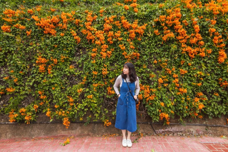 走進公園,最吸引人的莫過於那一條由炮仗花爬滿的拱形步道。花藤層層交織,形成一條如童話般的紅色隧道,彷彿置身於花的國度。隨手一拍,橙紅花朵襯托著蔚藍天空,每一個畫面都美得像一幅畫。當微風吹拂,花瓣輕輕飄落,營造出浪漫且詩意的氛圍,讓人流連忘返。