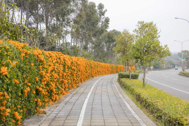 此處欣賞炮仗花的景點位於中科七星園區、正隆紙廠后里廠房正後方,可直接導航「后科炮仗花」。花牆沿著水泥人行步道一路綿延約300公尺,形成一條壯觀的金橘色隧道。雖然長度不算特別長,但因為花朵的密度極高,層層堆疊的花瀑讓整片景象顯得無比壯觀。