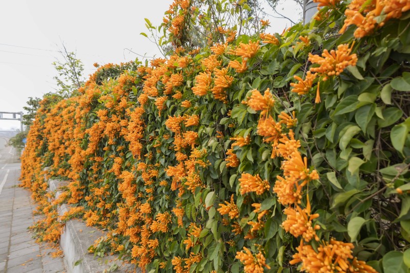 隨著春日的腳步悄悄來臨,台中的【后科炮仗花】也換上了華麗的橘金盛裝!每一串鮮豔的炮仗花如同小鞭炮般垂掛在藤蔓上,為這片寧靜的街景增添一抹熱鬧喜氣的色彩。