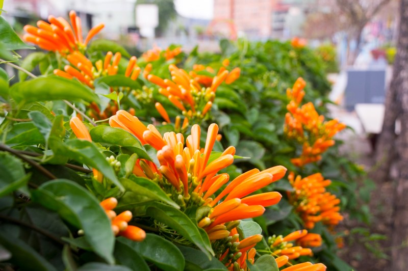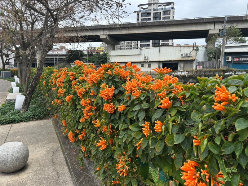 在春暖花開時節,許多花朵正相繼盛開,新北市蘆洲區鴨母港溝沿線的炮仗花,已隨著春天的腳步綻放盛開,橘紅色的花海爭春怒放,超過上百株的炮仗花聚串地攀爬在鴨母港溝左右岸兩側各約250公尺的人行道旁,盛開的炮仗花已近滿開,預計花季將至3月中旬,歡迎市民朋友把握這春暖花開的好時節,相約一同感受這熠熠奪目的亮麗景色。