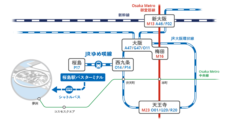 ■ 從JR新大阪站(A46)乘坐JR京都線前往大阪站(A47)大阪站換乘大阪環狀線(內繞)前往JR弁天町站(O15)弁天町站換乘Osaka Metro中央線前往夢洲站。